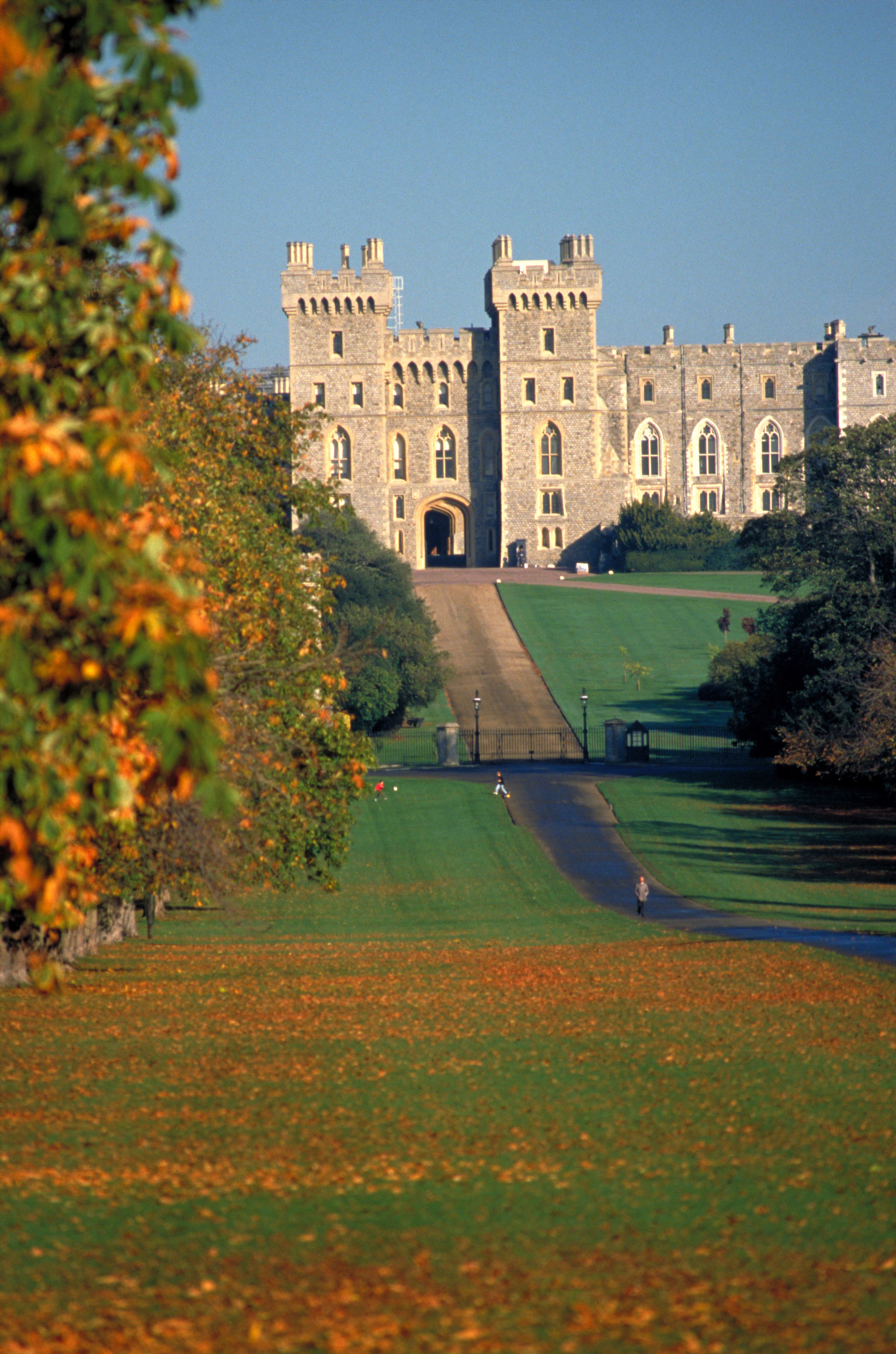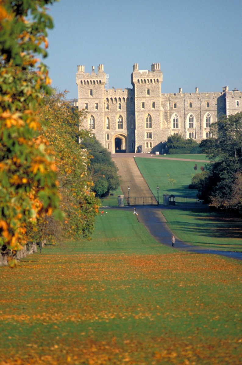 Autumn leaves carpet the ground either side of the long walk at Windsor Castle, the largest inhabited castle in the world.